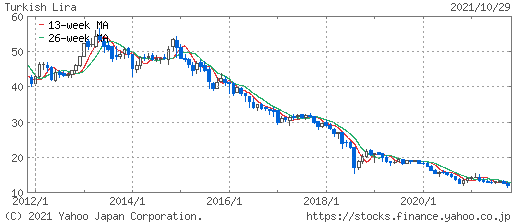 As the title suggests, the above graph shows the 10-year trend of the yen value of one Turkish lira. This was somewhat stable from 2012 to 2014, but has been declining almost consistently for the past seven years. This is a “strong yen, weak Turkish lira” situation.